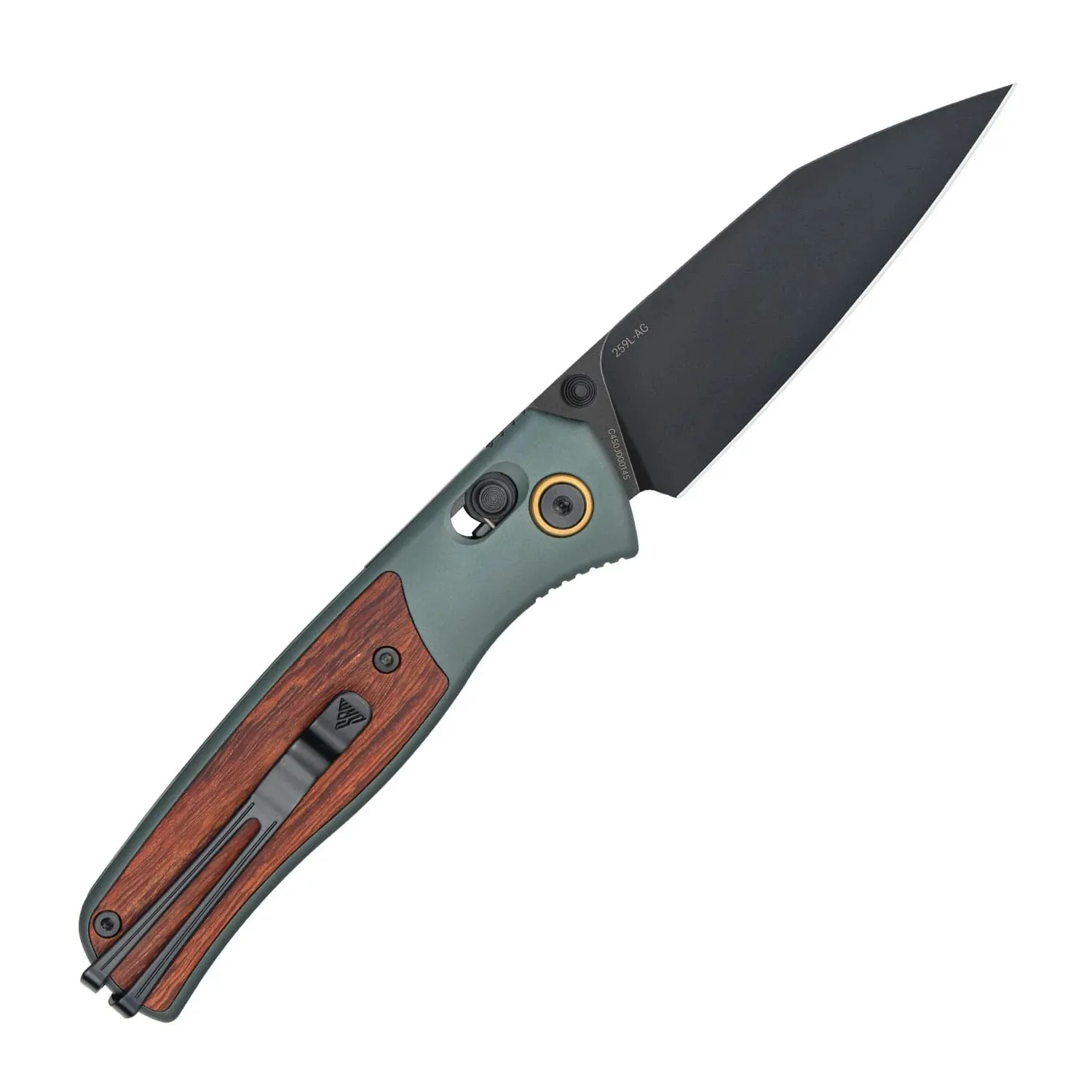 Name: Medal Overall Length: 193mm / 7.6” Weight: 75g / 2.65oz Blade Length: 81mm / 3.19” Blade Material: Sandvik 14C28N, HRC 57~59 Blade Finish: Black Oxidation Blade Thickness: 2.6mm / 0.1” Handle Material: Aluminum, Green oxidation w/ rosewood inlay Pivot Assembly: Ceramic Ball Bearing Lock: Ambi lock Features: 1. Mono-Chassis Liner ensures Ambi-Lock (axle-lock) knives be stronger and work smoothly, reliably and durably. 2. Ambi clip can be removed and installed on the other side of the handle without the need for additional tools. 3. Cooled Sharpening ensures that the blade maintains its hardness and performance characteristics, resulting in a sharper, more durable edge.