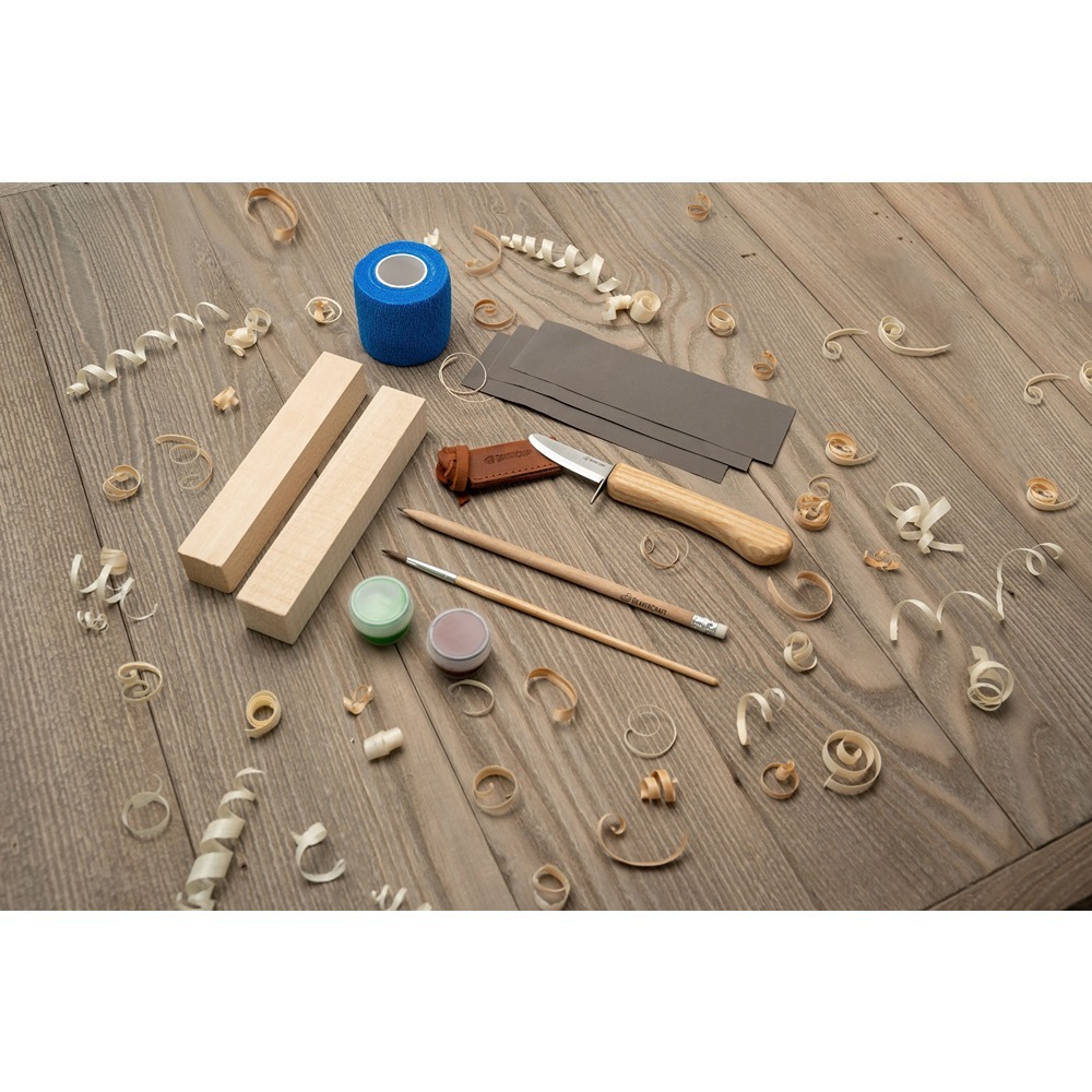 Designed to be safe and fun, the kit features a specially crafted whittling knife with a rounded tip and protective guard – a top choice for wood carving for kids. Paired with carefully selected basswood blocks, sandpaper, safety tape, a pencil, paints, and a brush, this kit ensures a smooth creative experience. Follow the step-by-step video tutorial and carve a stunning Spruce tree figure in no time.