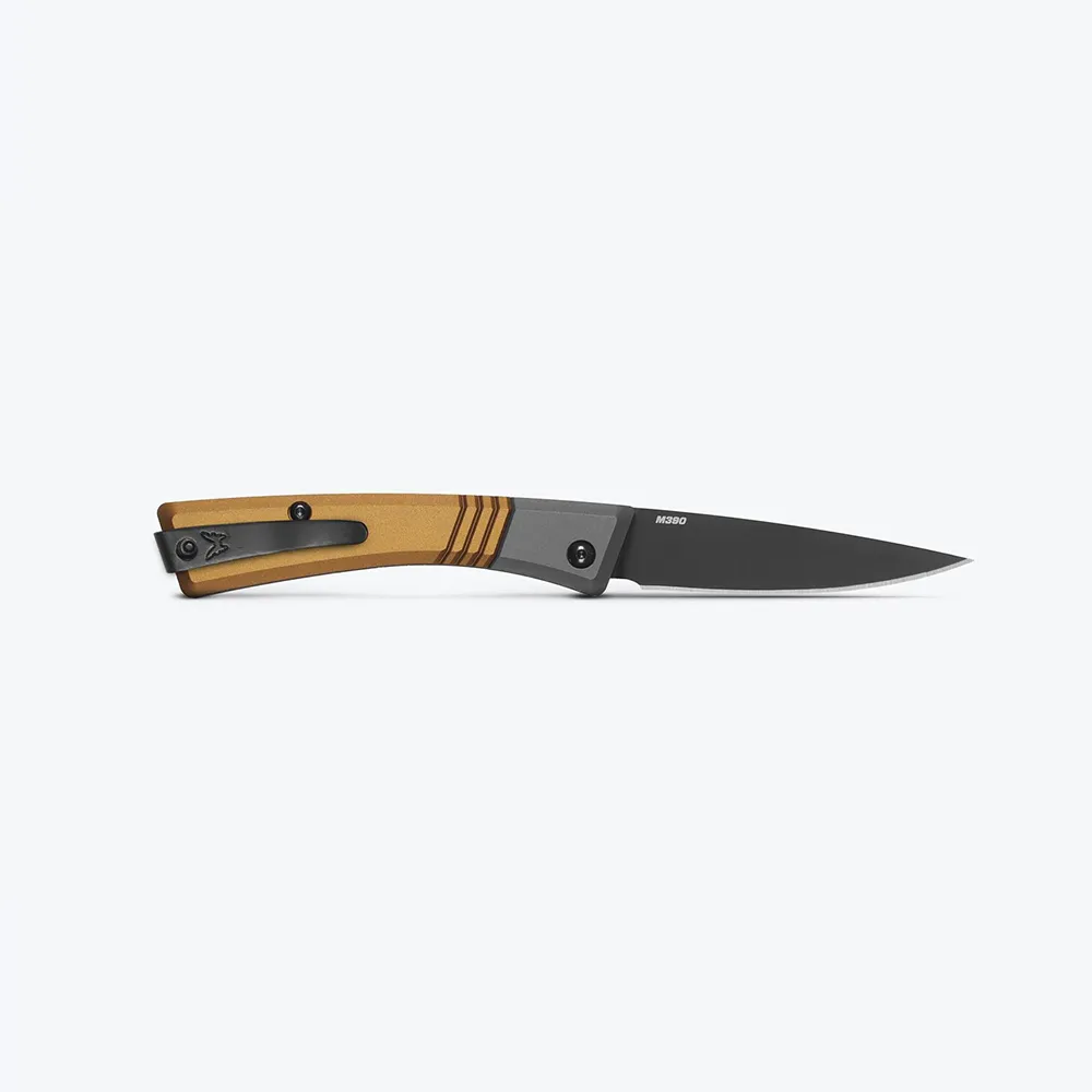 New Release October 2025 - Classic pocket knife functionality meets cutting edge precision engineering in the 315 Successor™, a modern slip-joint folder with vintage gentleman’s appeal. This sleek and elegant EDC is built with an Ash Gray aluminum bolster, distinct Burnt Brass aluminum handle scales, and a DLC-finished drop point M390 blade, favoured for its superior edge retention. Easy to actuate thanks to its solid detent open-close slip oint mechanism for buttery smooth operation with a distinct half stop. The minimalist nail nick, gives the Successor™ an ultra-clean blade aesthetic. Refined for elevated daily carry, the Successor™ comes complete with a black leather sheath and removable pocket clip, which can be affixed to the sheath or the knife.