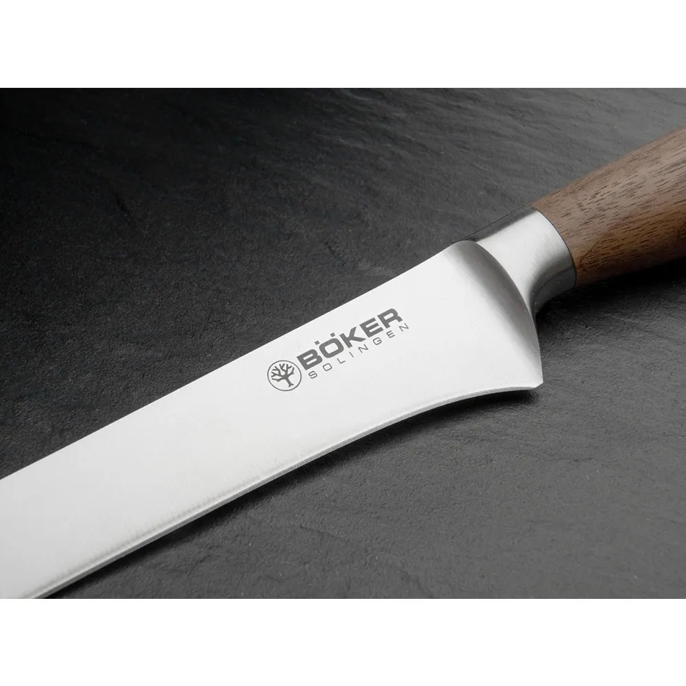 This item is the Boker Core 16.5cm Boning Knife. The Boker Core series offers an exclusive mix of premium materials, solid natural wood and brushed stainless steel. The range features single knives - 20cm Chef's Knife, 20cm Bread Knife, 16 cm Small Chef's Knife and 9cm Paring Knife, Santoku, Carving Fork- and beautiful 3-, 5- and 6-Piece Walnut Block Sets.