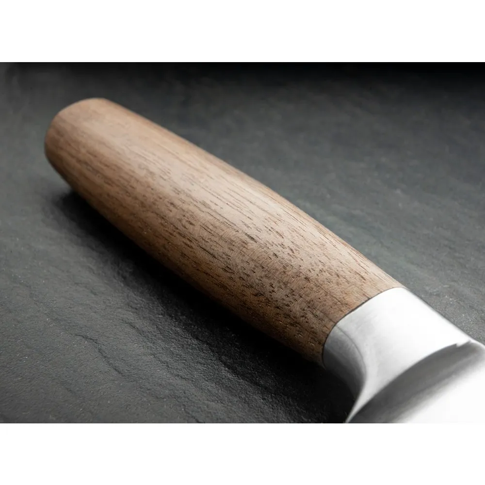 The knives' solid blade slugs are made from a chromium molybdenum vanadium alloy (X50CrMoV15), perfectly suited for premium kitchen knives, and are hand forged with Solingen craftsmanship, structurally optimised and hardened to 58 HRC. In order to give the blade a longer service life and even finer cut, our traditional hand grind is then highly polished. The forged bolster ensures a secure and protective grip.