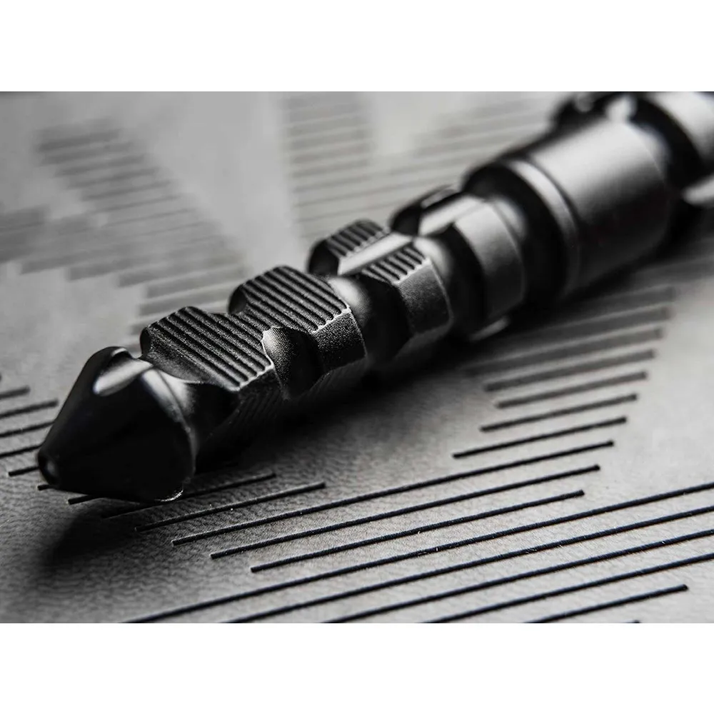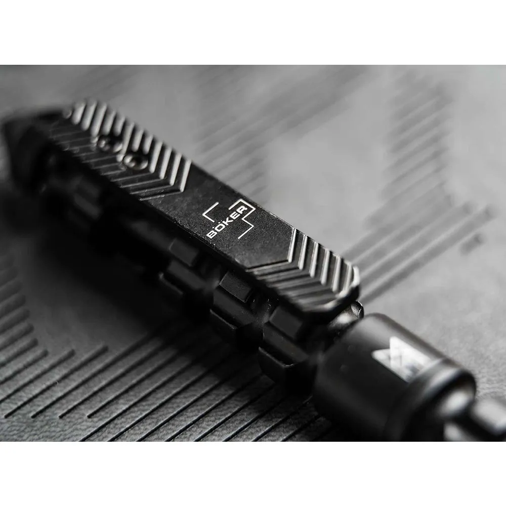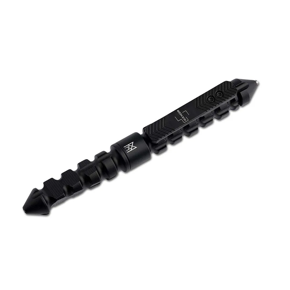 Extravagant, powerful, shrouded in legend - Dirk Hofmeister from Midgards Messer is known for his characterful designs with distinctive material dimensions. And for a good reason: the finest materials, an indestructible construction and a mythical design are essential to remain in favour with the Norse gods. The Boker Plus Fat Box Pen joins this select rank as a tactical pen and, thanks to the grace of the gods, is also destined for the inhabitants of earth. A precision milled body of black 6061 aluminium forms the high strength core of the biros. Deep grooves ensure exceptional haptics, while the flattened, ribbed areas in the front part promise a comfortable grip. Similar to a repeater, the bulky clip with Midgard's logo pushes the large capacity refills (ISO 12757-2) out and into the pen. Supplied with a hardened steel glass breaker at the end of the handle.
