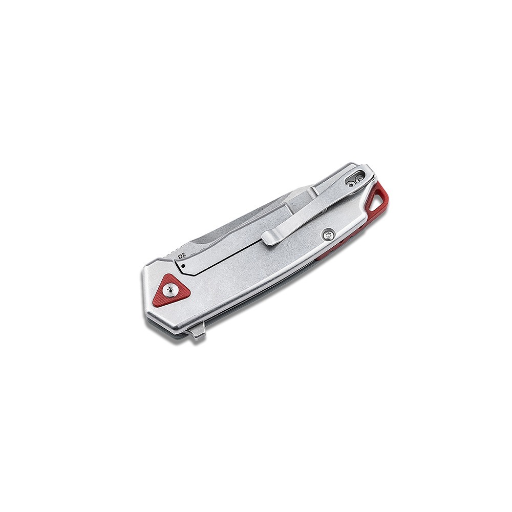 Gritty efficiency or smooth dynamics? - A question that doesn't even arise for the Boker Plus Gemtek by Alessandra de Santis. It can do both; not to mention the nuances in between. The designer from Hydra Design stands for passionate designs with maximum functionality. The Gemtek confidently joins the ranks and comes as a framelock folder with a ball baring modified drop point blade of cutting D2, which opens with a flipper and impresses with its gritty stonewash finish and decorative ricasso. The front handle scale is grey G10 with a discreet triangular texture for an optimal grip. Finely coordinated elements such as the red backspacer with anintegrated lanyard hole and a triangle on the back made of G10, which takes on the structure of the front handle, round off the appearance of the pocket knife in an attractive way. The tip-up (r) clip allows for deep carrying and makes the knife almost disappear in one's trouser pocket. Supplied with a quality nylon case for storage.