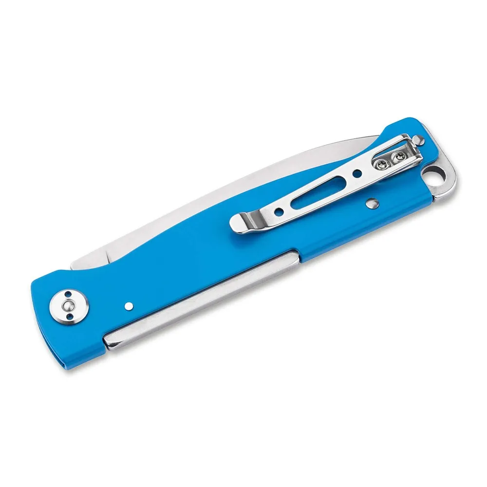 The proven Boker Plus Atlas once again refreshes the dusty EDC world map, this time with exciting and diverse colour variants. As a reliable slipjoint pocket knife with a handle of blue lacquered stainless steel, the Atlas combines a can-do mentality with simple elegance and emphasised agility. The minimalist construction is absolutely robust and makes thus handy knife a daily companion for all situations. The satin finished drop point blade of 12C27 steel opens via a nail nick, does not lock, and effortlessly handles all cutting tasks. Perfect for everyday use, perfect for one's pocket. Supplied with a lanyard hole and a clip (tip-up/right).