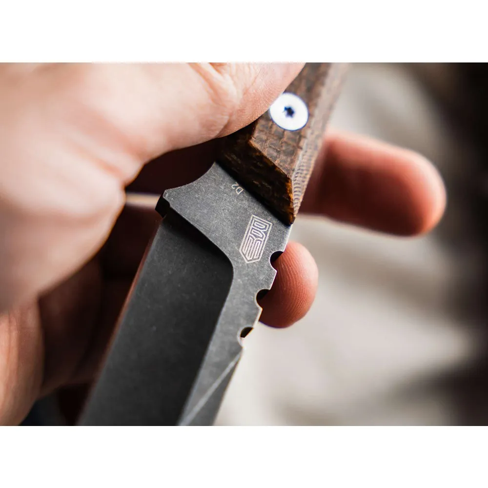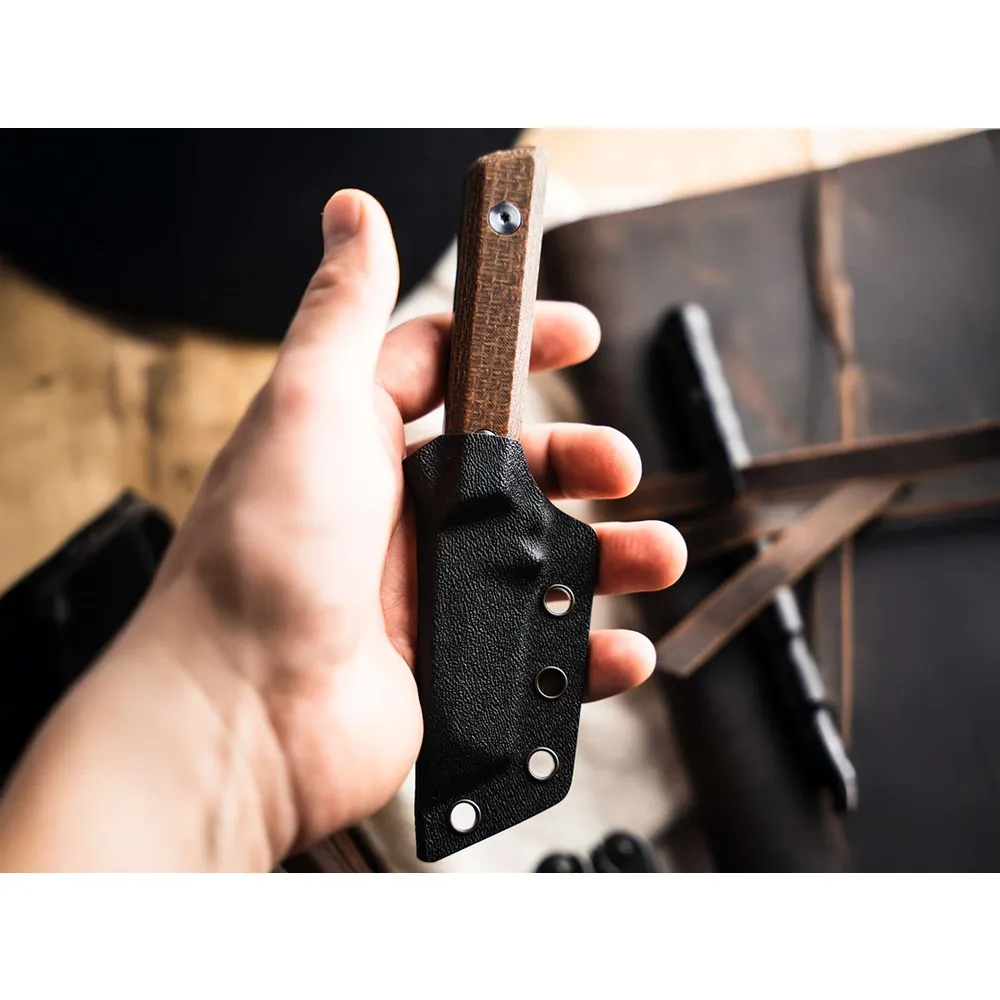 Thicker is better! Nobody knows this better than US knife designer Brent Michael Smith from Bald Man Knife & Tool, who has perfectly balanced the material dimensions of the Boker Plus Thicker Clipper and given it a new twist. The necessary knowledge is no coincidence, as Smith has more than 20 years of professional experience in the automotive and bicycle industry. The almost 6.3 inch (16 cm) long, fixed knife has a massive blade thickness of 0.22 inch (5.6 mm), allowing the compact powerhouse to flex its muscles, especially for demanding everyday and outdoor work. Straightforward full tang design with a D2 Tanto blade in a black stonewash finish, contoured handle scales made of intense brown Micarta and robust bolsters - no knife can offer more efficiency! The hand position, blade shape and pronounced jimpings on the back of the blade enable powerful, controlled and precise cuts. Supplied with a perfectly fitting Kydex sheath. Thick is chic!