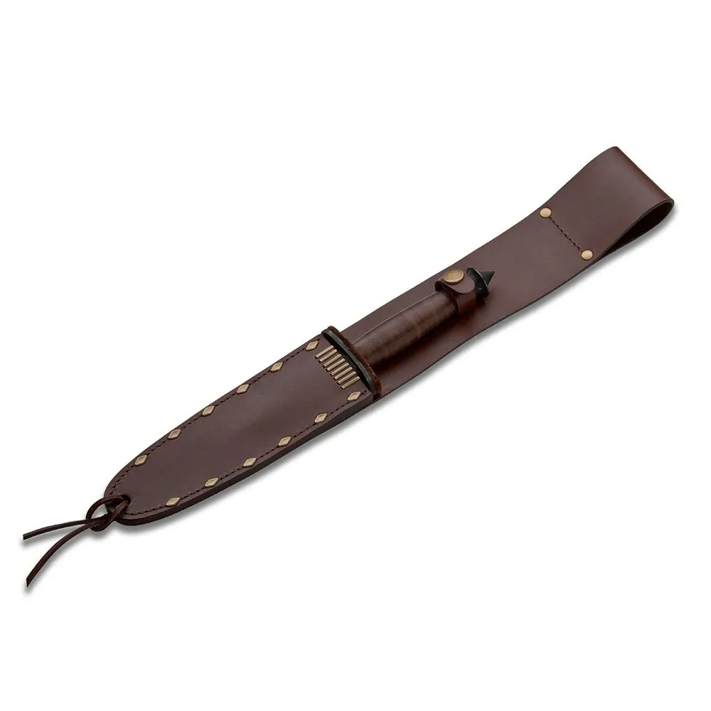 The Devil's Brigade was formed in July 1942. Under the official name of 1st Special Service Force, American and Canadian soldiers were brought together to form a special unit that was specially trained to fight behind enemy lines. The roots of many special units after the Second World War can be traced back to this unit. The many night operations, for which all faces were blackened for camouflage, probably for the first time, earned them the nickname Black Devils in the German Armed Forces, which testifies to the great respect the enemy had for this relatively small unit. The 1st SSF carried out many successful missions in Italy and France between 1943 and 1944 and was able to have a decisive influence on important situations in the course of the war. An important piece of equipment for the Devil's Brigade was the specially designed V-42 combat knife, which was also part of the intensive close combat training. The handle made of pressed leather discs ends in a tapered striking piece. A thin leather padding under the slightly curved parrying element was intended to prevent injuries when thrusting. The coated blade made of non-stainless 1095 carbon steel is sharpened on both sides and has a grooved thumb ramp in the ricasso area. This legendary dagger is still adorned with the emblem of the Special Forces of the US Army. We supply this select collector's item not only with the classic, deep-fitting leather sheath, but also with a replica of the unit's textile insignia, the red spearhead, as well as a reproduction of the original German language sticker with the text "Das dicke Ende kommt noch!" (The big end is yet to come!) together with the 1st SSF insignia, which was stuck on walls, cars, walls, doors, etc. behind enemy lines at night to demoralise them. A military historical ensemble worth collecting.