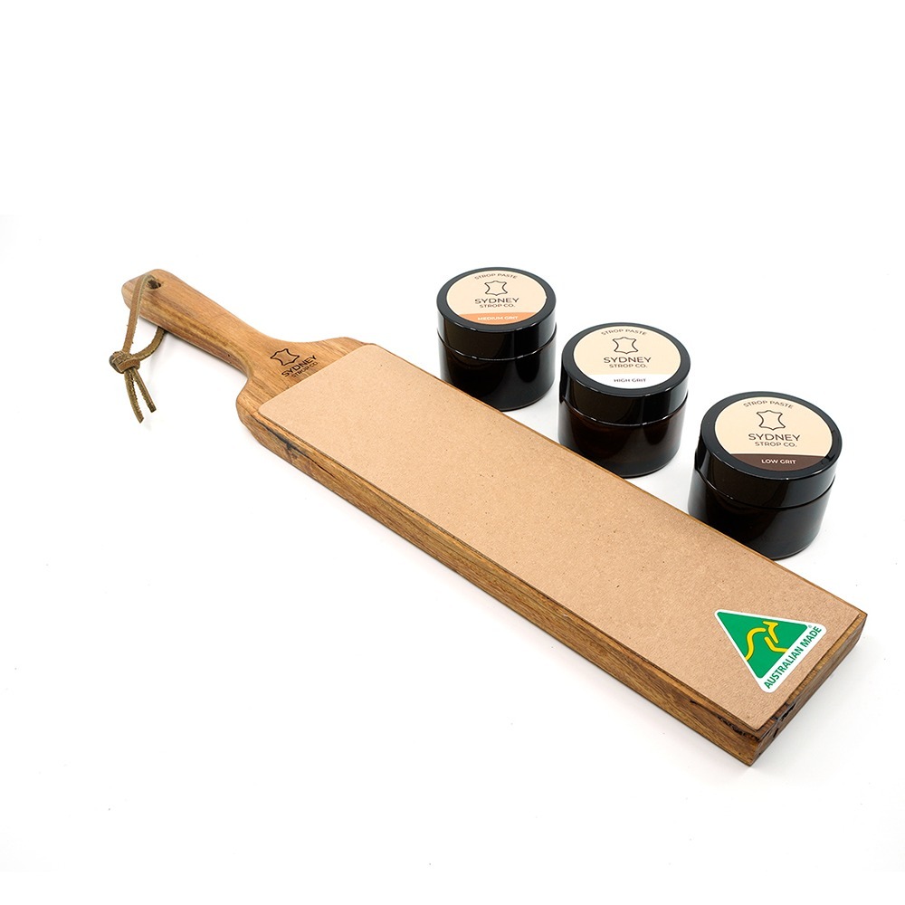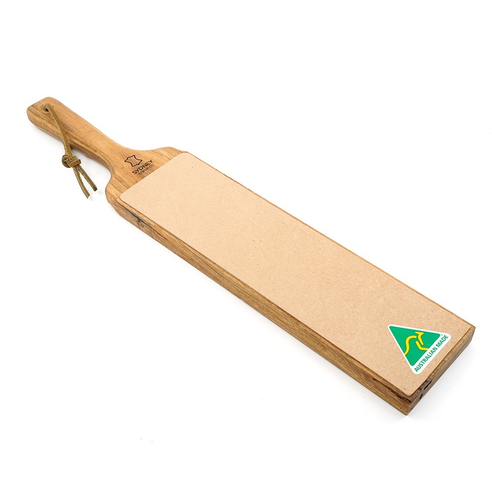 The Kangaroo strop features two smooth sides, one is for the final polish which can be used with the Sydney Strop Co. High grit paste or used bare with no paste and the other side can accommodate a Low grit paste.