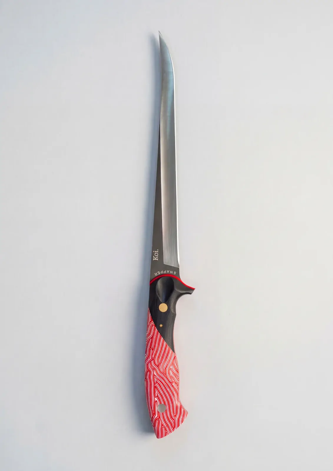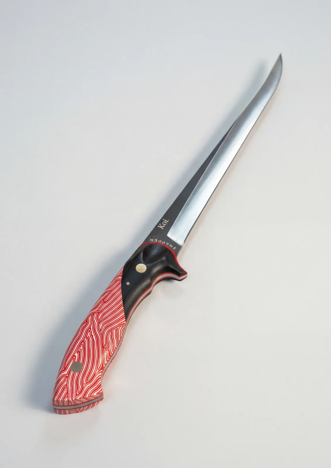The Koi Knives Snapper Fillet Knife is engineered for one of Australia's most iconic reef fish. Built with a robust 7-inch blade forged from premium Swedish 14C28N stainless steel, this knife tackles the firm flesh and larger frame of snapper with authority and precision. The semi-flexible blade provides the perfect balance between rigidity for cutting through the backbone and flexibility for working around the skull and ribcage, making quick work of those prized fillets whether you're processing a legal-sized squire or a trophy-sized red. The razor-sharp edge maintains its bite through multiple fish, gliding cleanly between skin and flesh for presentation-perfect fillets. Handcrafted in South Australia by a second-generation blacksmith, each knife features distinctive Australian wildlife etchings that celebrate our coastal fishing heritage. Whether you're filleting your catch dockside after a successful offshore session or preparing snapper for the barbecue at home, this knife delivers the professional performance that serious anglers and home cooks demand—because a fish this good deserves a blade this sharp.