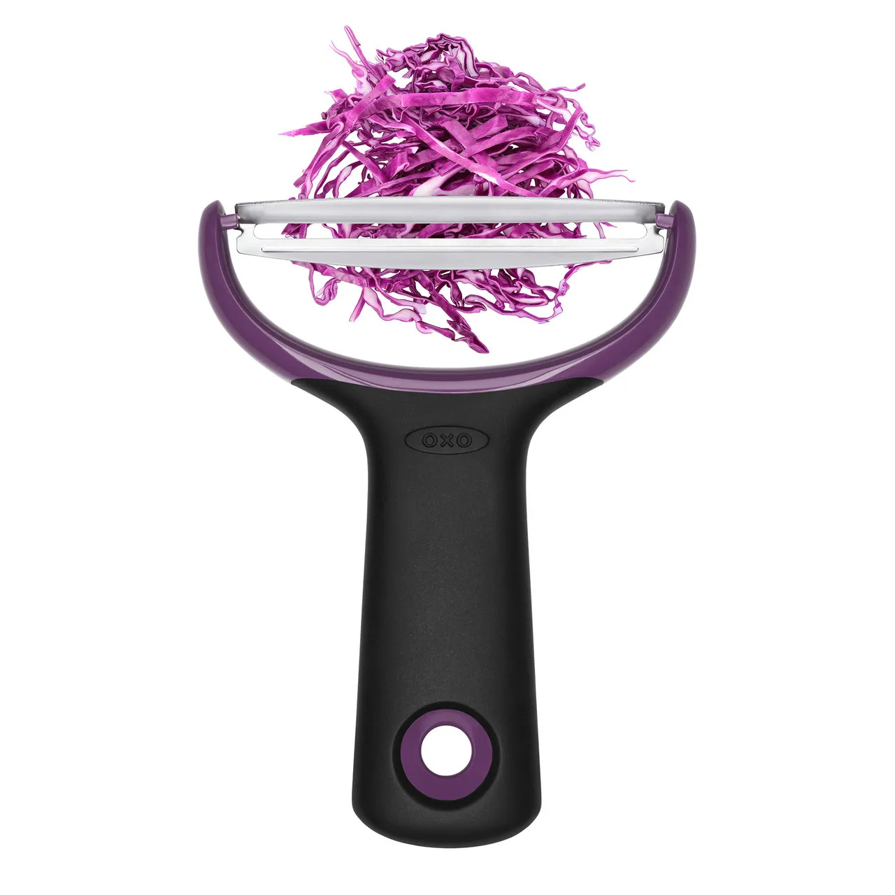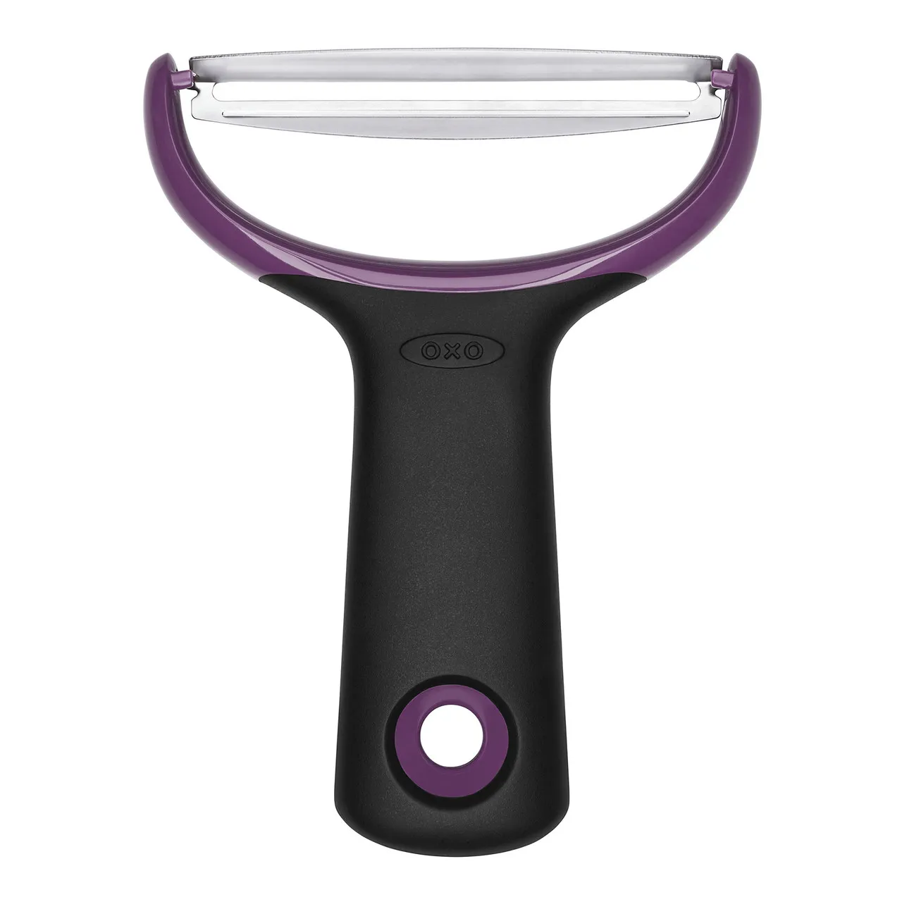 The OXO Good Grips Large Vegetable Prep Peeler makes quick work of big veggies like butternut squash, pumpkin, eggplant and even cabbage. The wide, sharp, Japanese stainless steel blade sails through thick skins, peeling produce with just a few swipes. The Y-peeler design prevents bruising and promotes fatigue-free prep. With an ergonomic, non-slip handle and rustproof, dishwasher-safe construction, you’ll reach for this Peeler again and again