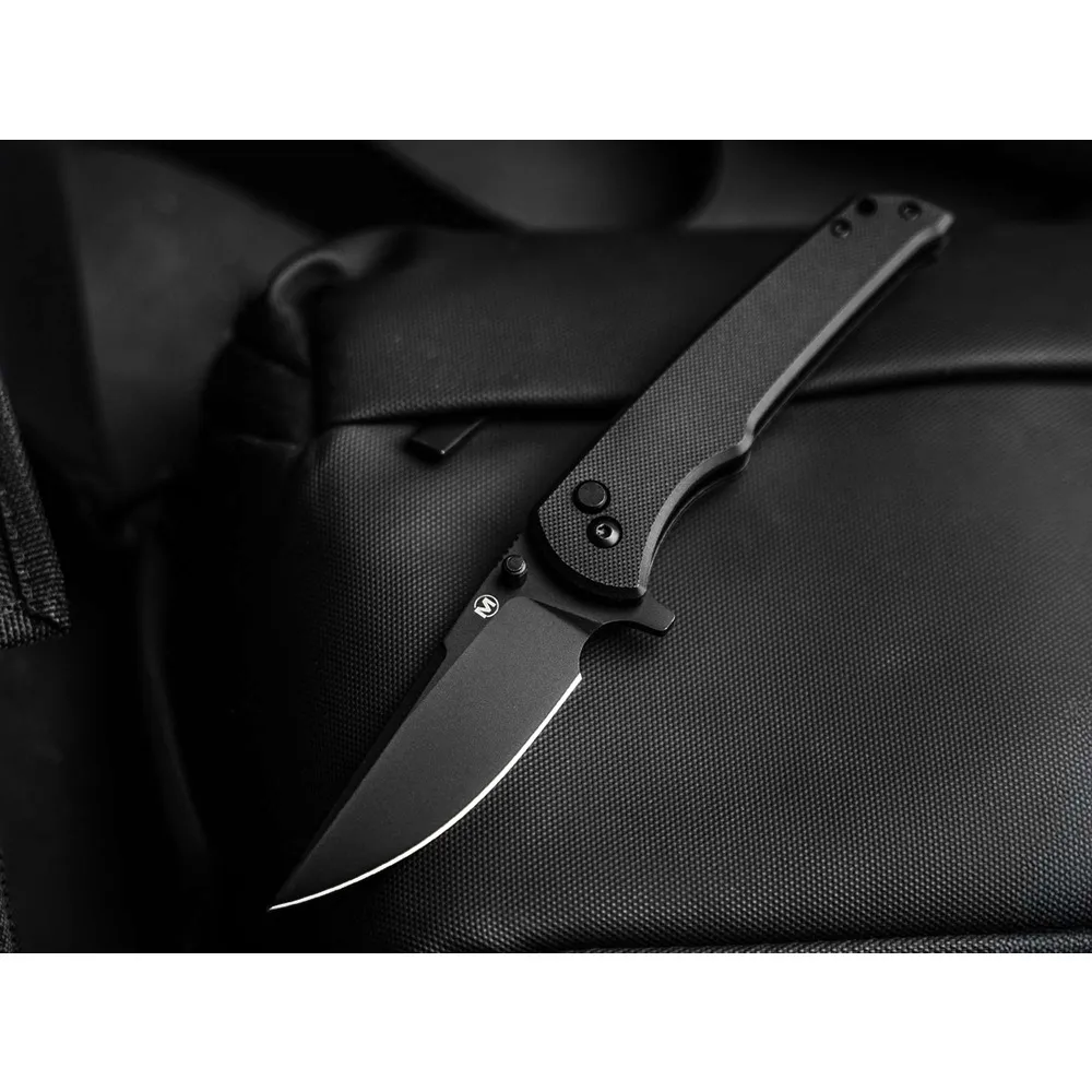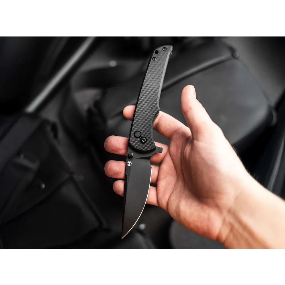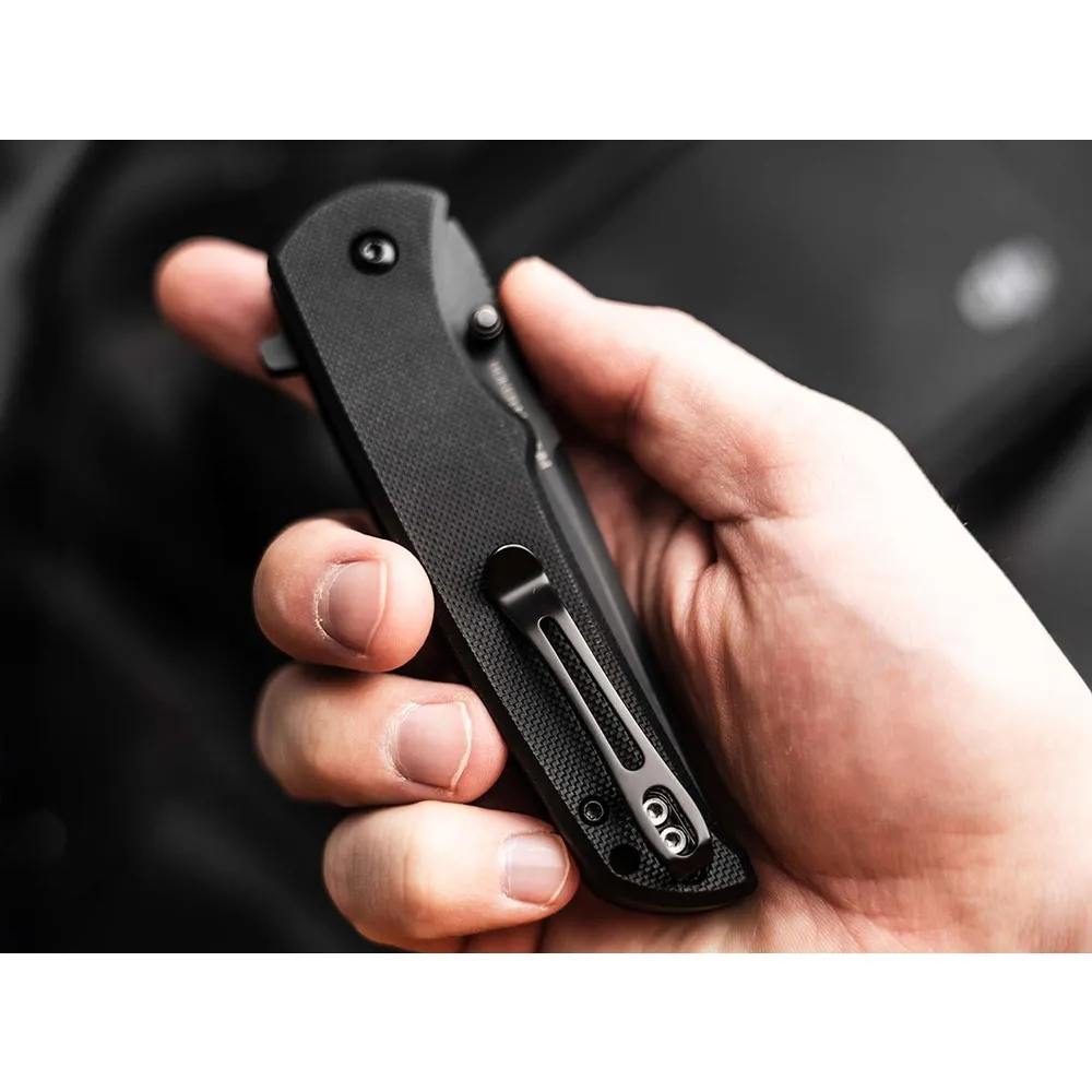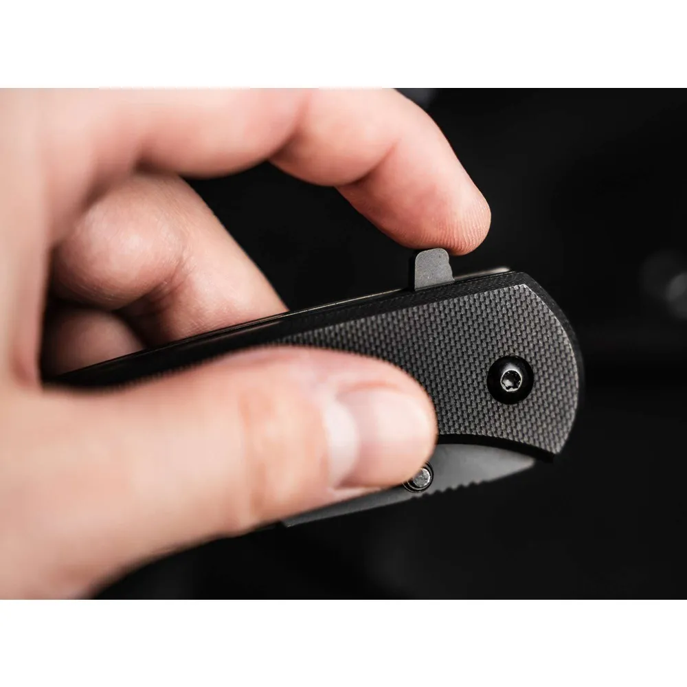 Boker expands the range of the Blackjay (Black Currawong) and captures a new habitat in the EDC world with the pocket knife of the same name. The black coated 440A blade with its decorative ricasso is reminiscent of the beak of the powerful-voiced bird and adapts perfectly to its surroundings thanks to several mechanisms for opening the knife. The pronounced flipper with a finger recess and jimpings on the back of the blade contribute significantly to work safety, while the thumb stud on both sides and the backspacer round off the tactical black camouflage mode. In keeping with this, the ergonomically balanced G10 handle picks up on the Blackjay's plumage and imitates its button-like eyes with the solid button lock. Supplied with a practical clip (tip-up clip/r).