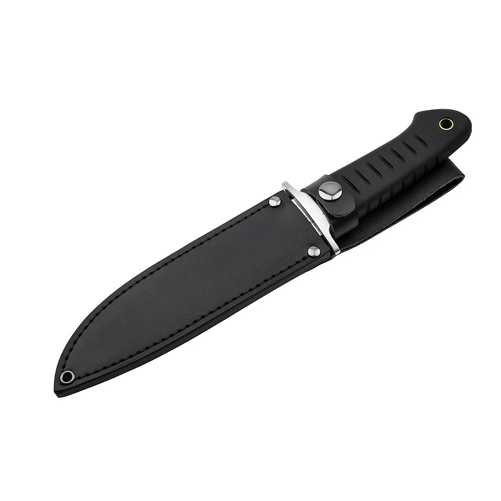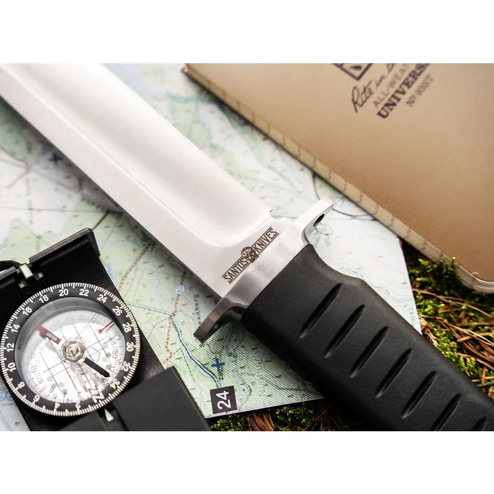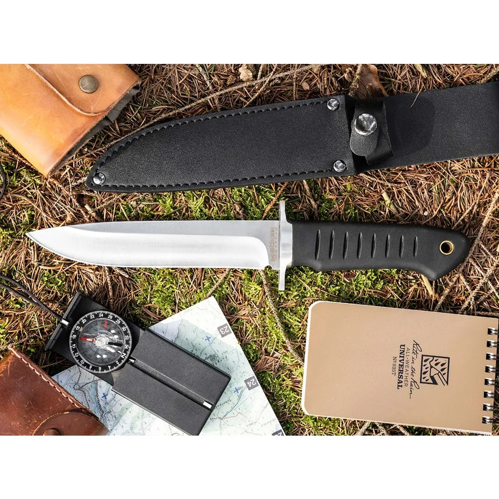 Tireless, athletic and ready for action at a moment's notice. The Mexican knife designer Fernando Santos conveys the character-defining qualities of the Sledgedog. The combination consists of a full sized, satin finished 440B drop point blade and an ergonomic TPR handle with non slip jimpings for maximum performance with full control. From the Arctic to the local undergrowth, the massive survival knife is not afraid of adverse conditions or demanding tasks. Cutting, slicing, chopping, carving - this is the desire to go, the unbridled drive of the Boker Magnum Sledgedog, which only knows one direction - forwards, unstoppable! For increased work safety, the handle is equipped with a finger guard that prevents the hand from slipping and, with the holes on the outside, offers an additional attachment option, for example, for use as a spear for fishing. A decorative hollow brass rivet is incorporated into the end of the handle for attaching lanyards. Supplied with a quality leather sheath.