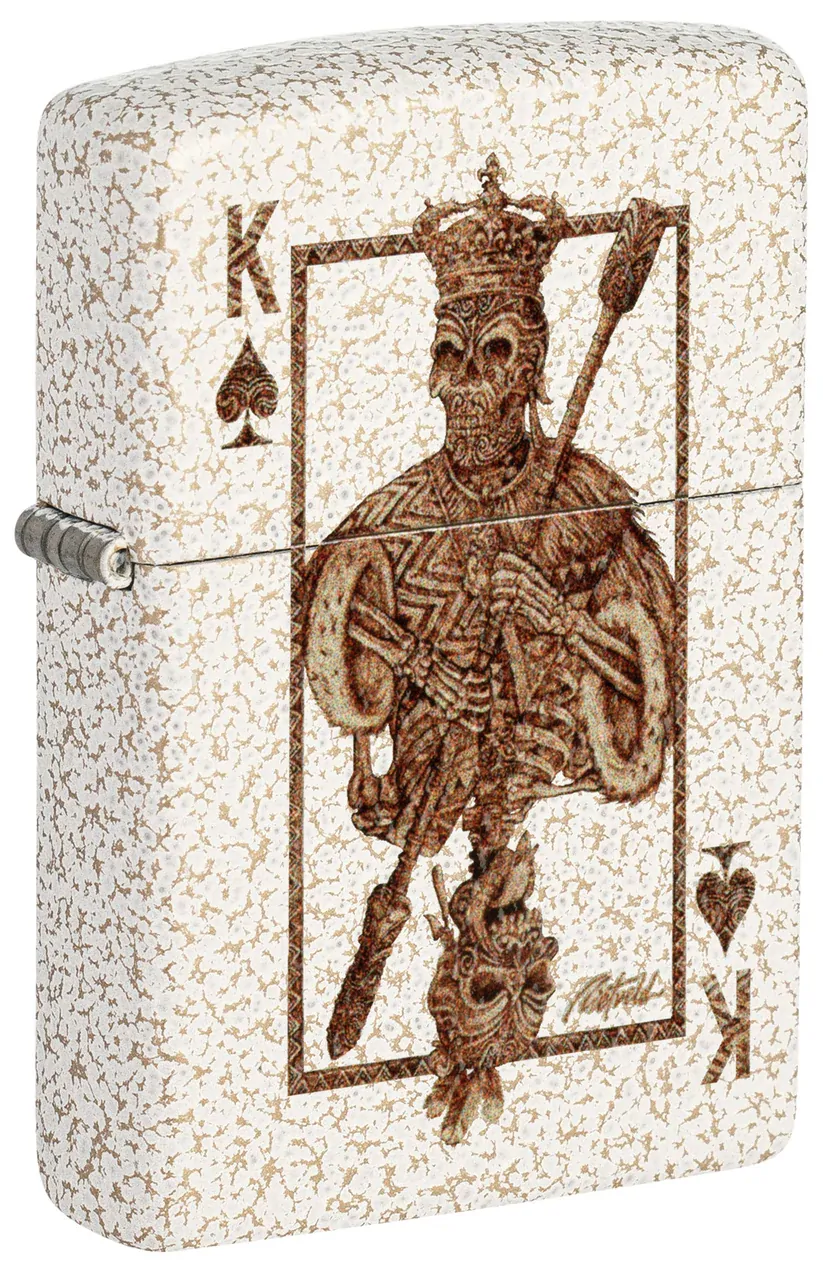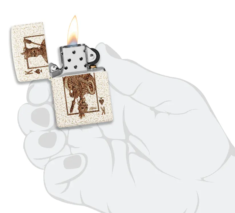 The art of Rick Rietveld returns on a classic Mercury Glass lighter. This Colour Image design, inspired by his Maori Card illustrations, depicts a regal skeleton in playing card form and is complemented by the mottled tones of the lighter's case beneath. Comes packaged in a gift box. For optimal performance, fill with Zippo lighter fuel.